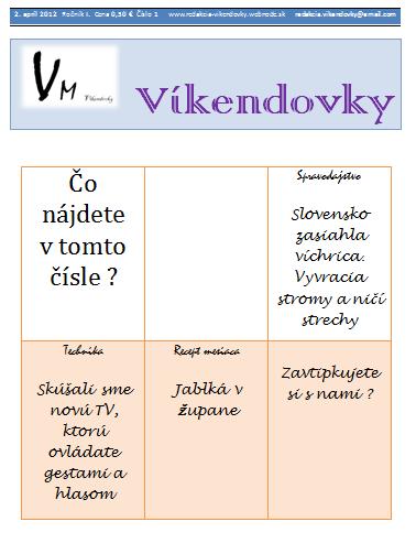 | Apríl 2012 | Víkendovky - 1. číslo - ukážka.jpg (30,4 kB) |
